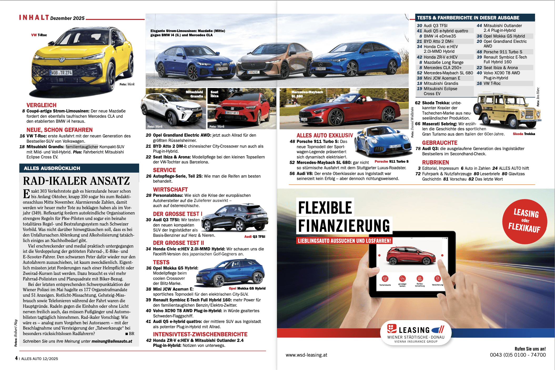 Das war’s dann aber auch schon mehr oder weniger mit den Elektroautos in diesem Heft, bei den Fahrberichten (neuer VW T-Roc, Facelift Seat Ibiza & Arona, Familien-SUV Mitsubishi Grandis) wird vorwiegend Sprit verbrannt, das gilt auch für die Einzel-Tests in dieser Ausgabe, sei es beim neuen Audi Q3 mit Basis-Benziner oder bei seinem großen Bruder Q5 als Plug In-Hybrid. Diesel? Fehlanzeige – an der Ölbrenner-Front gibt es wenig Neues. Aber wir dürfen schon die kommende Doppelausgabe spoilern: Im Jänner/Februar-Heft wird sogar im Exklusiv-Teil selbstgezündet – mit dem stärksten Diesel am Markt.
