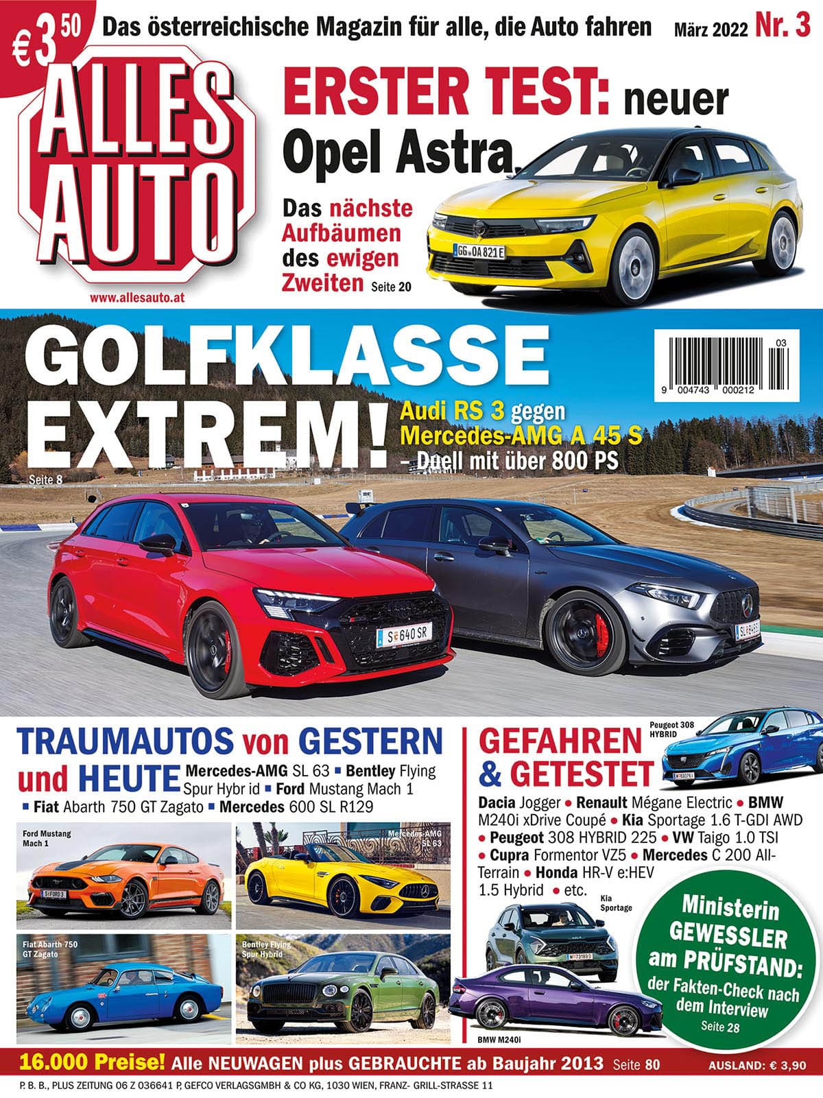 Die März-Ausgabe von ALLES AUTO steht im Zeichen der Golfklasse: Wir vergleichen die zwei extremsten Vertreter des Segments, zudem gibt es erste Fahreindrücke des brandneuen Opel Astra. Ebenfalls mit dabei: Weitere, unzählige Auto-Tests quer durch alle Klassen sowie Ministerin Gewessler am Prüfstand – ab sofort im Handel!