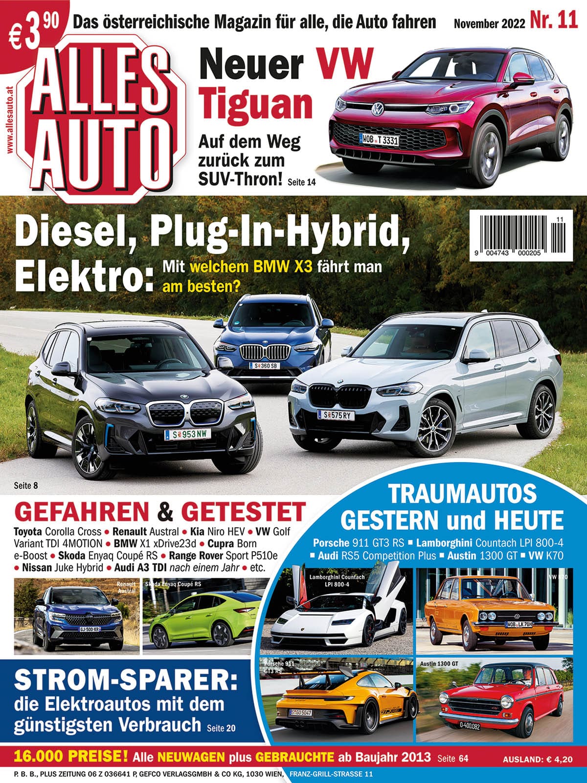 ALLES AUTO Ausgabe November: Mit welchem BMW X3 man am besten fährt: klassischer Diesel, Plug-In-Hybrid oder doch als Elektroauto? Schaffen es die Wolfsburger mit der Neuauflage des VW Tiguan zurück auf den Thron? Gefahren und getestet: VW Golf Variant und BMW X1 mit Diesel und Allrad, sowie die sportlochen Stromer Cupra Born e-Boost und Skoda Enyaq Coupé RS und viele mehr. Kann die Neuauflage des Lamborghini Countach so begeistern, wie das Original in den 1970er-Jahren? Vergleichsweise nüchtern geht es der neue Porsche 911 GT3 RS an, etwas gemütlicher geht es im VW K70 und im Austin 1300 GT zu. Wir geben einen Überblick über die genügsamsten Stromer – ab sofort im Handel!