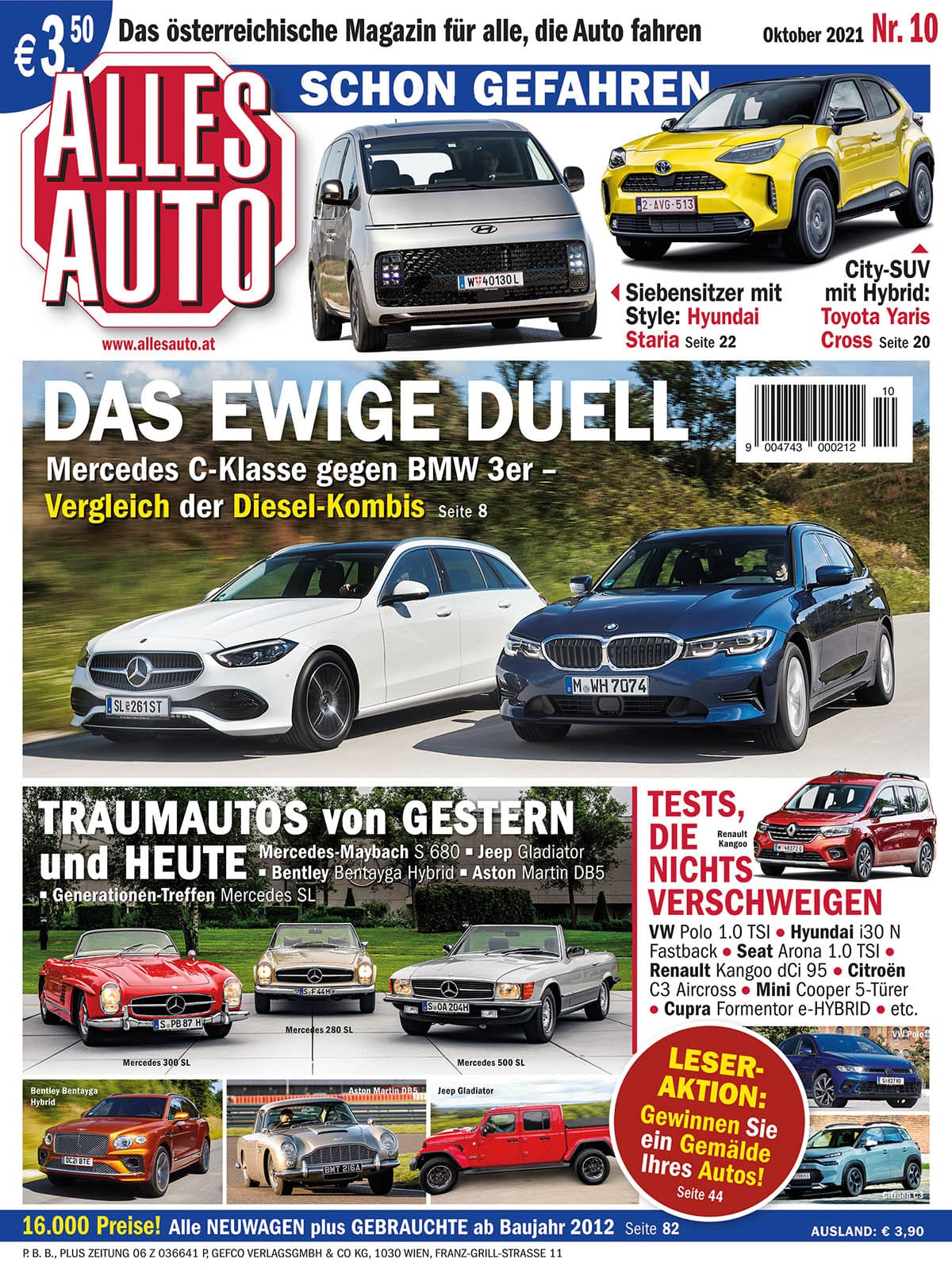 Im Mittelpunkt unserer Oktober-Ausgabe steht ein ewiges Duell: Die neue Mercedes C-Klasse tritt im Vergleich gegen den BMW 3er an. Welcher Diesel-Kombi wird sich am Ende durchsetzen können? Außerdem im Heft: Fahrberichte vom neuen Toyota Yaris Cross, Hyundai Staria, jede Menge Tests sowie bunte Stories über allerlei Traumautos – ab sofort im Handel!