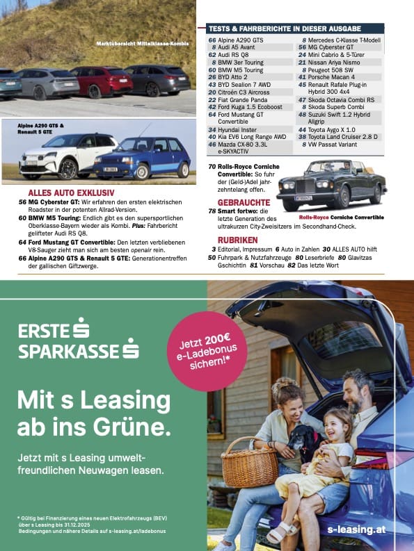 Ganz schön vielfältig ist auch der Reigen der anschließenden Traumauto- Strecke. Wir beginnen mit dem Elektro-Roadster MG Cyberster, hanteln uns über den neuen BMW M5 Touring und den Audi RS Q8 (beides Allradler mit Biturbo-V8, ersterer elektrifiziert) über den Ford Mustang in der Cabrio- Variante (Saug-Achtzylinder – wo gibt es so etwas noch?) zum Rolls-Royce Corniche Convertible, dem Inbegriff für luxuriöses Cabrio-Fahren in den 70ern und 80ern. Dazwischen finden Sie ein besonderes Generationen- Treffen, das gleichzeitig einen Vergleich der Antriebs-Konzepte mit sich bringt: Ab Seite 66 gibt es ein Meet & Speed mit der neuen Alpine A290 und ihrem Urahn im Geiste, dem Renault 5 GTE aus den 80ern. Nach dieser bunten Strecke wird es leider dunkel im Heft. Wir tragen Trauer, weil uns mit Helmut Zwickl eine Lichtgestalt des heimischen Motorjournalismus verlassen hat. Den Nachruf auf den Doyen der Renn- berichterstattung lesen Sie auf Seite 76/77.