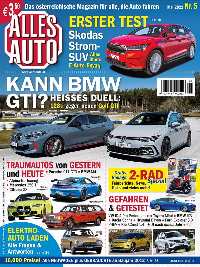 Auch Fahrspaß muss sein! Der große Vergleichstest in dieser Ausgabe ist ein Duell etwas abseits der Vernunft-Schiene, ab Seite 8 tritt der BMW 128ti gegen das Urmeter der sportlichen Kompakten an: den VW Golf GTI. Die beiden Probanden: Zweiliter-Vierzylinder-Turbo mit rund 250 PS – und das in keiner Weise elektrifiziert. Gut so, schließlich hat man das Gefühl, neue Modelle stammen nur noch aus der Hochvolt-Abteilung.