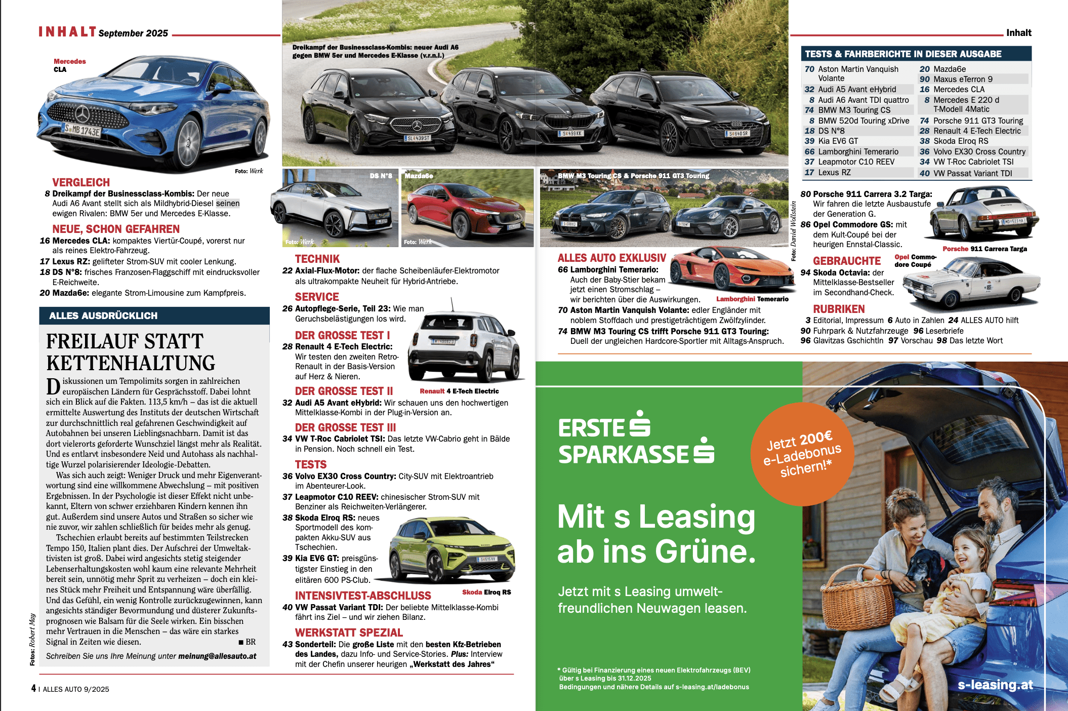 Redakteur Reichel hat sich aber nicht nur um die große Cover-Story gekümmert, sondern auch wie gewohnt die Gebrauchtwagen-Rubrik verfasst – diesmal geht es um den Bestseller Skoda Octavia. Für immer mehr Menschen sind Autos aus zweiter Hand erste Wahl geworden, das liegt vor allem an den gestiegenen Neuwagen-Tarifen. Diesen Trend ortet auch Claudia Katzlberger im Gespräch mit uns ab Seite 62. Es ist das offizielle Siegerinterview unseres traditionellen Werkstatt-Sonderteils für die September-Ausgabe. Erstmals durften wir dazu eine Dame treffen, die 58-Jährige leitet seit mehr als 20 Jahren den von den Eltern gegründeten Betrieb im oberösterreichischen Tumeltsham. Und das offensichtlich sehr gut – heuer wurde der Suzuki- und Nissan-Betrieb von unseren Lesern zur „Werkstatt des Jahres“ gekürt. Welche Autohäuser in ihrer Nähe empfehlenswert sind, lesen Sie in der großen Liste der Top-Betriebe ab Seite 46.