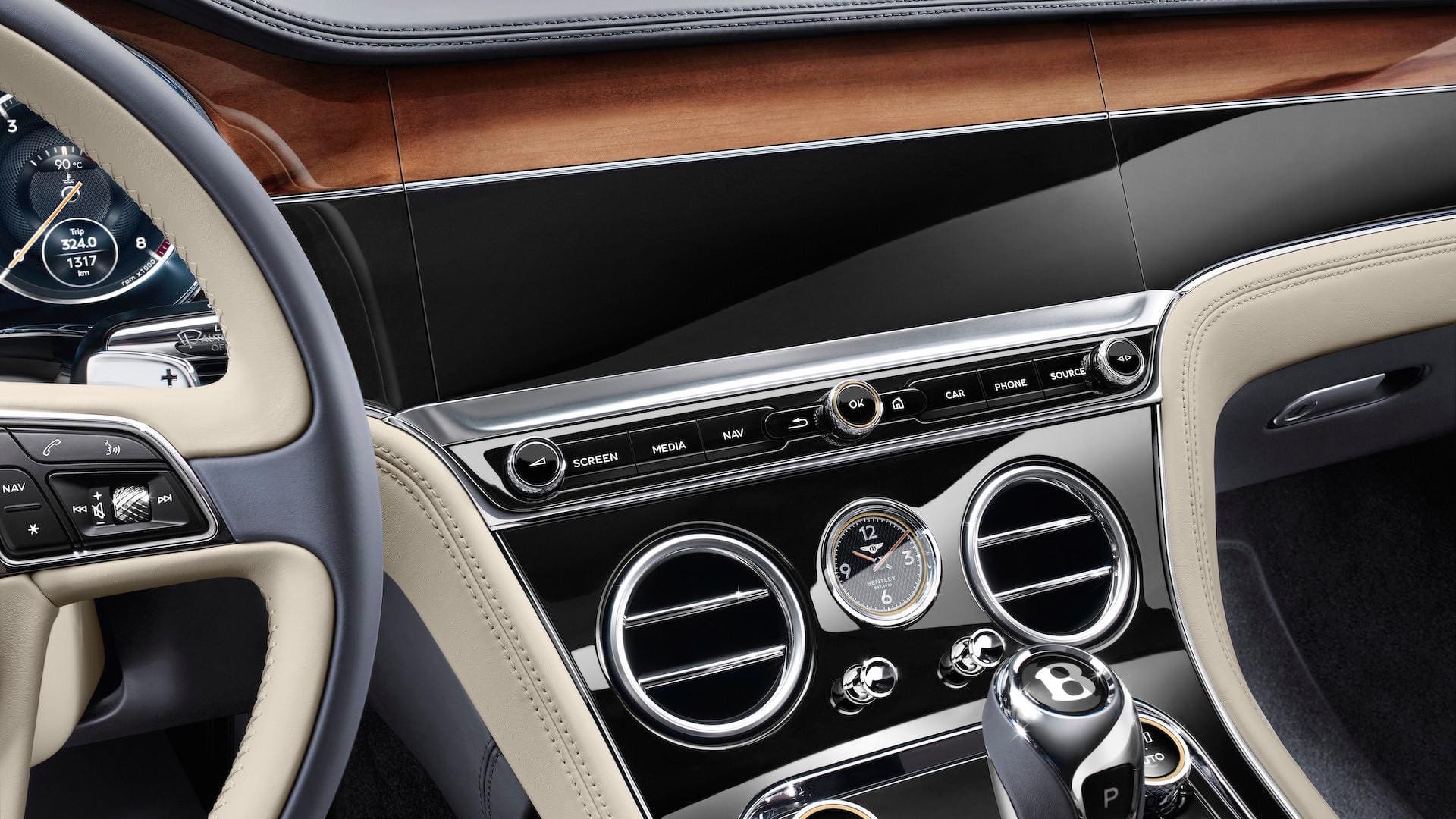 So richtig faszinierend wird der neue Conti aber im Innenraum. Vor allem beim Blick auf das Armaturenbrett. Dort sieht man nämlich erst einmal sehr wenig – nichts nämlich, wenn man gezielt nach einem Bildschirm sucht. Der verbaute, 12,3 Zoll große Screen versteckt sich hinter einem wie eine Revolvertrommel drehendem Element mit drei Seiten über dem Mitteltunnel und wird nur sichtbar, wenn man ihn braucht. Alternativ kann auch einfach eine plane Fläche oder eine mit noblen Rund-Instrumenten zu Tage gefördert werden. James Bond lässt grüßen.