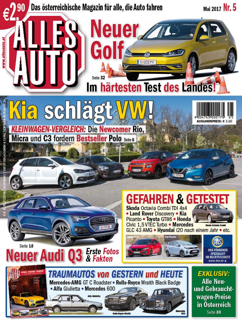 Achterbahn der Gefühle für VW im neuen Heft: Während der neue Golf in unserem großen Test brilliert, schlägt Kia den Polo in unserem Kleinwagenvergleich und stößt ihn vom Thron. Auch abseits der Wagen aus Wolfsburg haben wir wieder viele spannende Artikel parat: Eine Ausfahrt mit dem Mercedes-AMG GT C Roadster etwa, Tests zum neuen Honda Civic, dem aufgefrischten Skoda Octavia oder Toyota GT86, Eindrücke von Testfahrten mit dem neuen Kia Picanto, Toyota Yaris oder Land Rover Discovery und vieles mehr. Das alles und noch viel mehr steckt in unserer jüngsten Print-Ausgabe – ab sofort im Handel!
