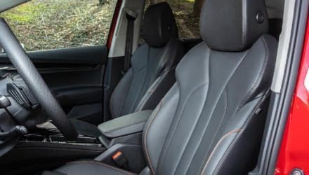 Im Fahrgastraum gibt sich der erste E-SUV der Marke ansonsten keine Blößen – vor allem, wenn das Upgrade-Paket mit Leder, Klavierlack und LED-Beleuchtung zum Aufpreis von 1572 Euro gewählt wurde. Allerdings mit kleinen Abstrichen bei der Ergoniomie: Die breite, tiefsitzende Tastenleiste über der Mittelkonsole drückt gegen das Knie, was sich nur durch ziemlich weites Zurückrücken des Fahrersitzes beheben lässt – womit allerdings der Fußraum in Reihe zwei unnötig reduziert wird. Auch der Verstellwinkel der Fahrersitzfläche ist eher gering – ohne erwähntes nach hinten Rücken gelingt kein Abstützen der Oberschenkel, was vor allem auf Langstrecken unkomfortabel werden könnte.