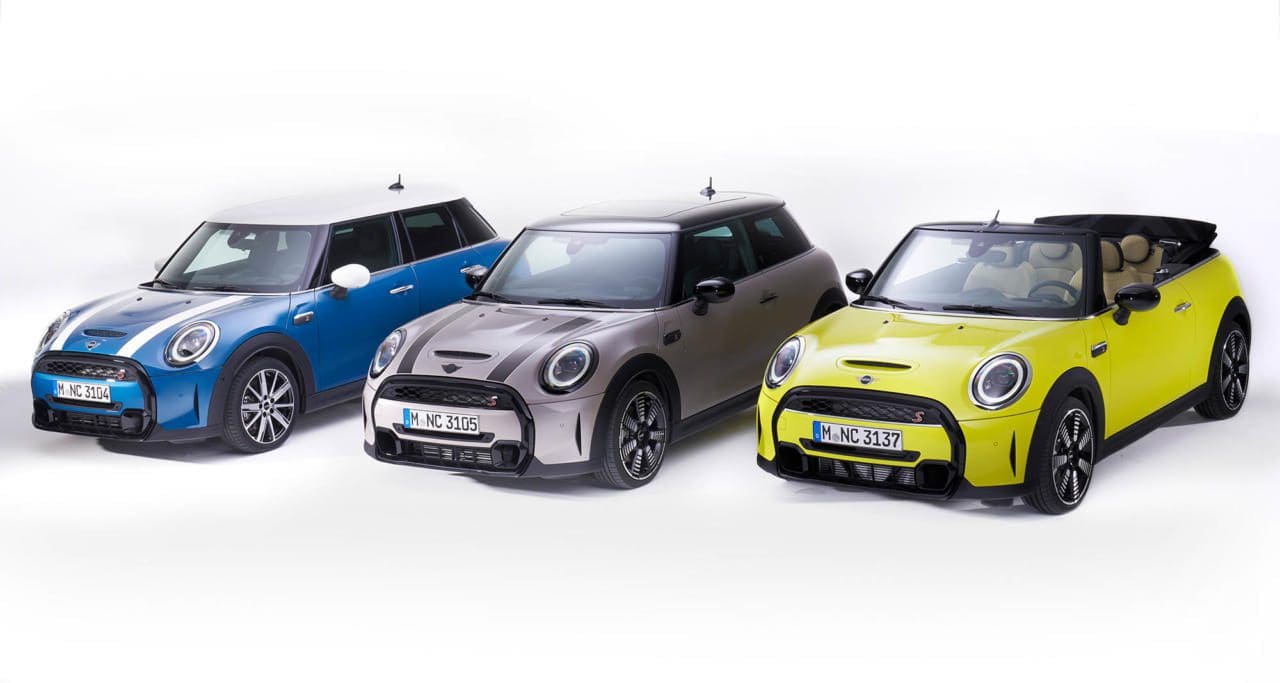 Im März 2021 bringt Mini ein Facelift für Drei- und Fünftürer sowie das Cabrio auf den Markt. Mit einer reduzierten Formensprache, frischen Akzenten im Cockpit, neuen Komfort-Optionen, einer modernen Lichtinszenierung und optimiertem Bediensystem. LED-Scheinwerfer und -Heckleuchten sind jetzt serienmäßig, letztere immer im „Brexit“-, sorry, „Union Jack“-Design, der Kühlergrill wurde prominenter gestaltet und hat eine leicht hexagonale Form, Front- und Heckschürzen wurden optisch beruhigt.