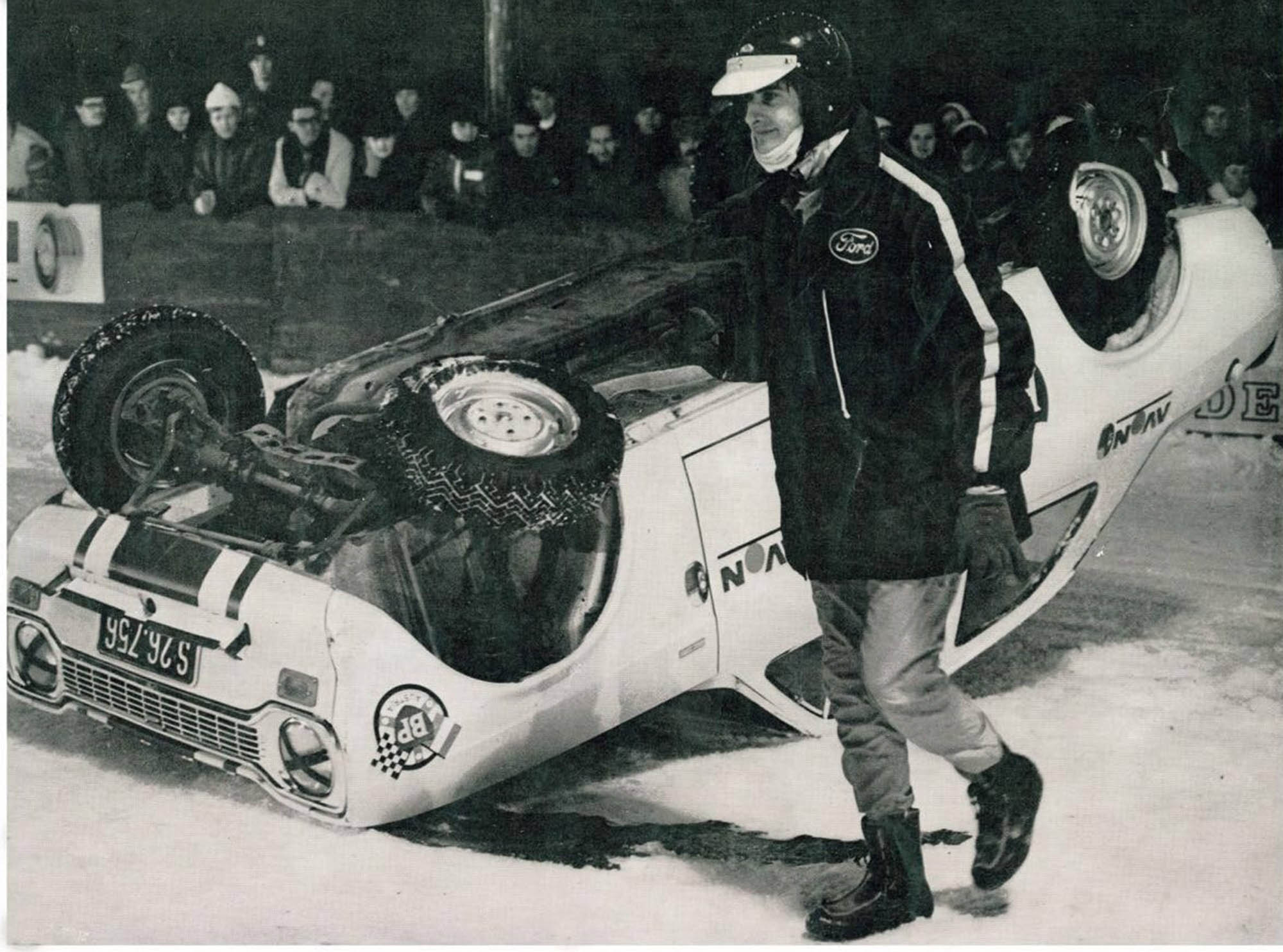 Die Überschläge selbst waren eher eine matte Sache für einen g’führigen Obersteirer. Für den ersten Knaller ließ ich einen Holzbalken quer zur Kurve eins platzieren – der hat dann für den „Roll over“ das Vorderrad aus der Aufhängung gerissen. Für den zweiten ließ ich hinter der Holzbande der Rennbahn einen Eiskeil anfrieren. Als ich mit der Front des Autos die Bande durchbrach, verlieh der Keil dem rechten Vorderrad das entscheidende Drehmoment um die Längsachse und rollte den betagten Mercedes 220 aufs Dach.