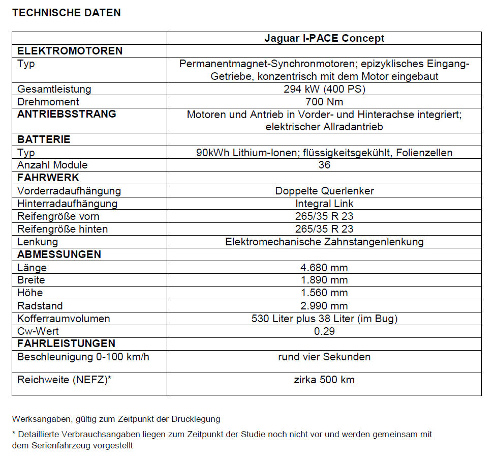 Das Design ist dabei schon jetzt schlüssig: klassische Jaguar-Elemente wie die flachen Heckleuchten und der charakteristische Grill, breite Schultern und eine dynamische Seitenlinie umschließen gut die weit nach vorn geschobene Passagierkabine. Das geht natürlich vor allem wegen dem E-Antrieb, dessen im Boden platzierte Akkus noch dazu für einen niedrigen Schwerpunkt sorgen. Überhaupt betont Jaguar gern die sportliche Seite dieses Stromers. Die Leistungsdaten passen: 400 PS und 700 NM Drehmoment aus zwei E-Motoren (Pro Achse einer) sorgen für eine 0-100-Zeit von rund 4 Sekunden. Die intelligente Allrad-Steuerung soll zudem für viel Traktion und Fahrspaß sorgen.