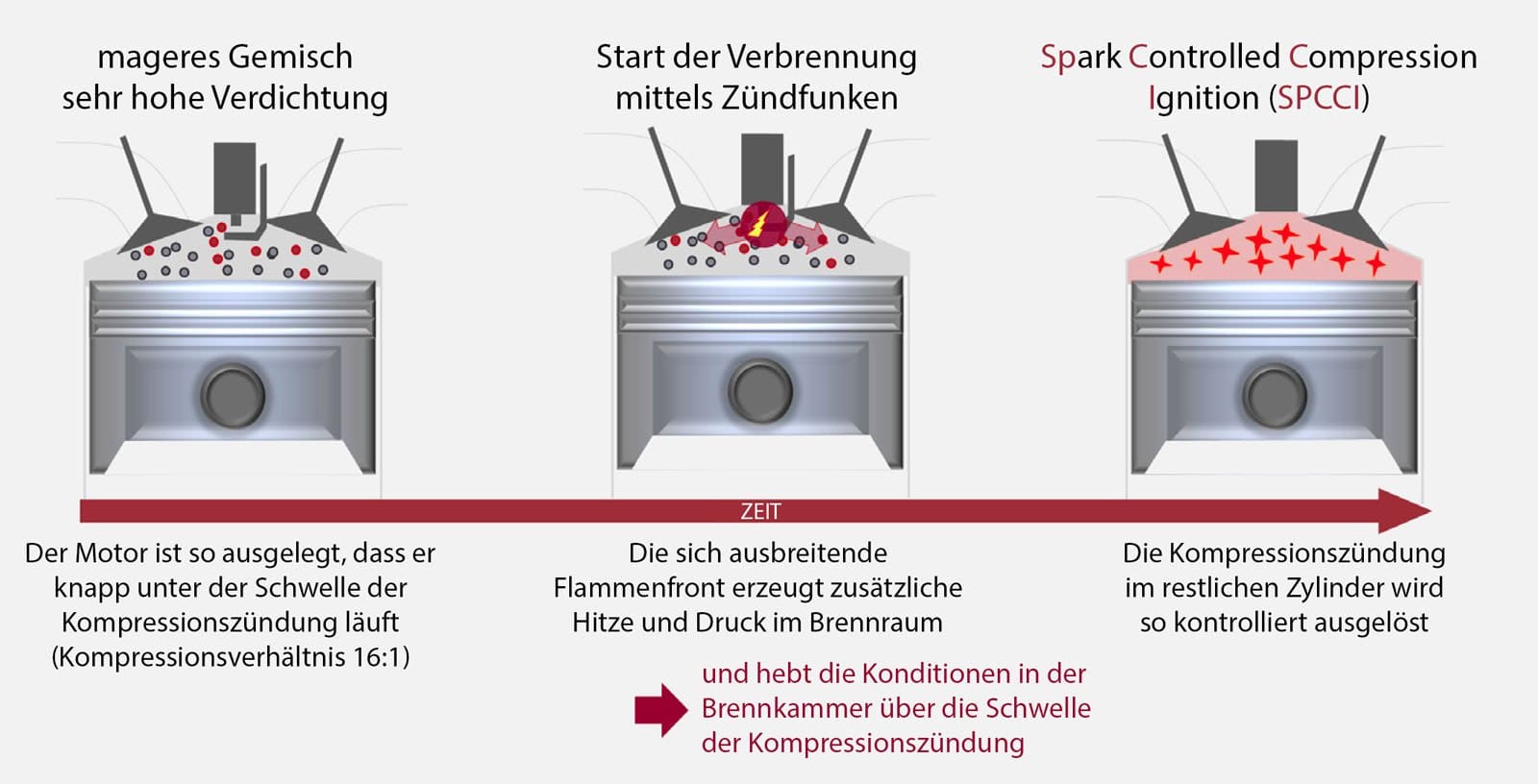 Den Mazda-Technikern ist es mit dem sogenanntes SPCCI-Verfahren (Spark Controlled Compression Ignition, auf Deutsch also Zündungs-kontrollierte Kompressions-Zündung) gelungen, sich ein eigentlich unerwünschtes Verbrennungsphänomen zunutze zu machen – ähnlich einem wilden Pferd, das gezähmt vielversprechende Leistungen erbringen kann. Diese Form der Verbrennung hat den Vorteil, dass sie wesentlich schneller und effizienter abläuft. In letzter Konsequenz kann so der Kraftstoffverbrauch (im Vergleich zum Vorgänger-Motor) um bis zu 20 Prozent gesenkt werden.