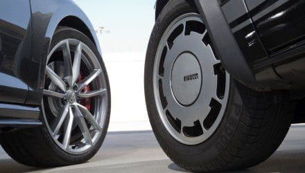 Insofern ist der Golf GTI Clubsport schon eine besondere Auflage, denn hier ging VW erstmals bewusst Richtung Sportlichkeit. Downforce dank Spoilerwerk. Bewusst agil ausgelegtes Fahrwerk. Direktere Lenkung, Semislicks, das hat es beim GTI bis jetzt alles noch nicht gegeben. Warum? Weil es Dinge sind, die man auf der Straße alle nicht braucht. Aber zum 40er darf man ja ruhig ein wenig feiern. So, nun aber zu den Unterschieden und Gleichheiten. Rechts sehen wir die Visitenkarten eines jeden Autos, die Räder: 1983 galten 14 Zoll große Felgen als stattliche Größe. Der Pirelli (hier in der schmucklosen, aber seltenen W64-Ausführung) bekam als einziger Einser die Pirellifelgen verpasst. Reifenbreite: immerhin 185 Millimeter! Der Clubsport kommt optional mit 19-Zöllern daher. Reifenbreite: 225 Millimeter, auf Wusch sogar breiter.