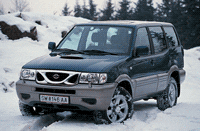 Der Terrano II sieht nun von vorne seinem großen Bruder Patrol ähnlich. Das Diesel-Triebwerk bleibt akustisch weitgehend dezent, bietet passablen Durchzug, bringt aber unter 1500 Touren die Karosserie stark zum Dröhnen. Das straff abgestimmte Fahrwerk stellt einen gelungenen Kompromiss zwischen Straßen- und Geländetauglichkeit dar. Präzise, aber indirekte Lenkung, langwegig-exakte Schaltung, durchschnittlich wirksame, leicht fading-anfällige Bremsen. Im bis zu 7 Personen aufnehmenden Innenraum geht das Platzangebot in Ordnung, die großen, konturierten Sitze stellen ebenso zufrieden wie das voluminöse, gut nutz- und variabel erweiterbare Gepäckabteil (die dritte Sitzreihe lässt sich vorklappen und leicht ausbauen). Die komplette Ausstattung des Luxury“ macht seinem Namen Ehre. Ausreichende Serien-Sicherheit, gute Werthaltung, solide Verarbeitung.TECHNIKR4, Turbo, 2664 ccm, 92 kW (125 PS) bei 3600/min, max. Drehmoment 278 Nm bei 2000/min, Fünfgang-Getriebe, Hinterradantrieb, zuschaltbarer Allradantrieb, Scheibenbremsen v (bel.), Trommeln h, ABS, L/B/H 4697/1755/1850 mm, 7 Sitze, Wendekreis 11,4 m, Servo, Reifendimension 235/70 R 16, Tankinhalt 80 l, Kofferraumvolumen 115-1995 l, Leergewicht 1875 kg, zul. Gesamtgewicht 2580 kg, 0-100 km/h 16,7 sec, 60-100 km/h (im 4. Gang) 9,5 sec, Spitze 155 km/h, Normverbrauch (Stadt/außerorts/Mix) 11,9/ 8,7/9,9 l, Testverbrauch 11,9 Liter DieselPreis: EUR 32.695,51 (S 449.900,-) Diesen Test finden Sie im Sonderheft ALLES AUTO Test Extra 2002„