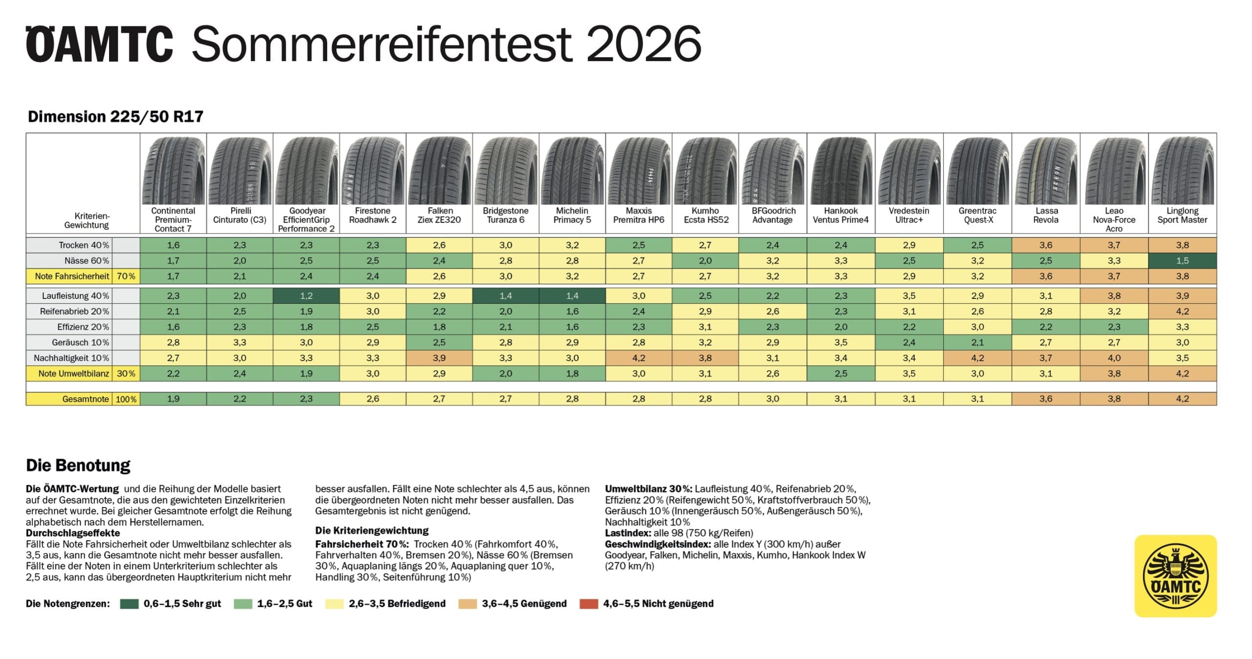 Für den Sommerreifentest 2026 haben der Mobilitätsclub und seine Partnerorganisationen 16 Modelle der Dimension 225/50 R17 untersucht. Drei Modelle schafften diesmal die Note „gut“: Continental PremiumContact 7 als klarer Testsieger sowie Cinturato (C3) von Pirelli und EfficientGrip Performance 2 von Goodyear zeigten die ausgewogenste Gesamtleistung im Feld. „Diese Reifen überzeugten sowohl bei der Fahrsicherheit auf trockener und nasser Fahrbahn als auch bei Verschleiß, Effizienz und Umweltbilanz“, fasst ÖAMTC-Reifenexperte Steffan Kerbl zusammen.