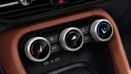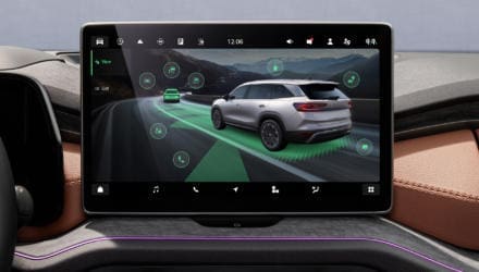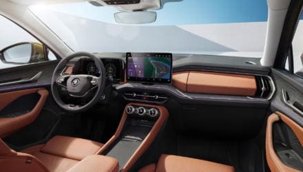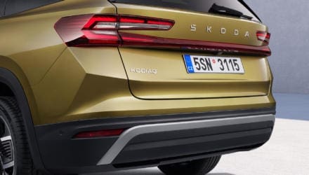 In puncto Exterieur fallen sofort die aufgewerteten Scheinwerfer auf. Recycelte Textilien und umweltfreundlich gegerbtes Leder im Innenraum sollen das klare Bekenntnis der Marke zu Nachhaltigkeit unterstreichen. Neben einer neuen Angebotsstruktur mit mehreren Design Selections und Optionspaketen bietet der Kodiaq auch ein neues Interieurkonzept. Das freistehende Infotainmentdisplay misst 13 Zoll Bildschirmdiagonale, ein Head-up-Display steht erstmals optional bereit. Der Automatik-Gangwahlhebel befindet sich nun an der Lenksäule, die Mittelkonsole wirkt dadurch besonders aufgeräumt. Ein Novum für Škoda: die neuen Škoda Smart Dials. Sie kombinieren haptische Steuerungselemente mit 32-Milllimeter-Displays und erlauben so eine einfache und intuitive Bedienung der zahlreichen Fahrzeug- und Infotainmentfunktionen. Die neue Telefonbox lädt bis zu zwei Smartphones gleichzeitig induktiv mit 15 W. Zudem kühlt sie die Geräte während des Ladevorgangs.