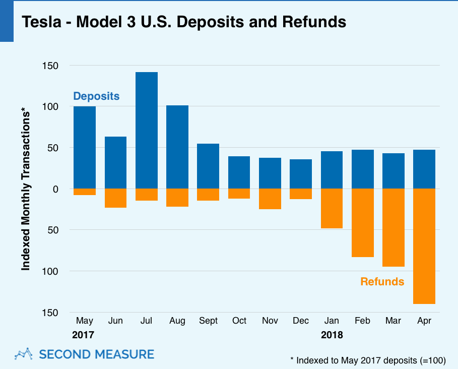 Nun lässt sich dieses „immer mehr Leute“ auch in Zahlen fassen. Laut einer Analyse des Daten-Unternehmens Second Measure (SM) haben mit April 2018 ganze 23 Prozent aller Vorbesteller ihre Reservierung wieder aufgehoben und ihr Geld zurückbekommen. Interessant dabei: Obgleich schon seit dem Bestellstart im April 2016 einzelne Refundierungen zu verzeichnen waren und es immer wieder welche gab, so stieg die Zahl der Leute, die ihr Geld zurück wollten, seit Jänner 2018 deutlich stärker an als zuvor und überstieg im selben Zeitraum auch erstmals die Anzahl der Neureservierungen:
