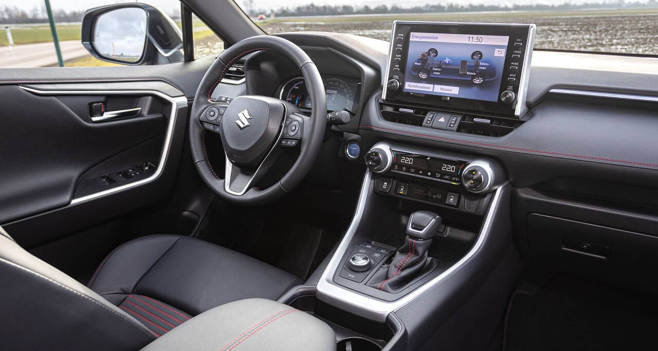 Toyota-Vertraute werden den Innenraum natürlich als 1:1-Kopie entlarven, außen hat man sich dagegen Mühe gegeben, Designelemente von Suzuki unterzubringen – was durchaus gelungen ist, der Across sieht recht flott aus. In Sachen Ausstattung haben die Japaner eine eigene Variation kreiert, die etwas unter Toyotas Top-Trimm VIP liegt – so vermisst man beim Suzuki zum Beispiel Onboard-Navi, Premium-Sound und Sitzbelüftung, die volle Garde an Assistenzsystemen ist aber an Bord.